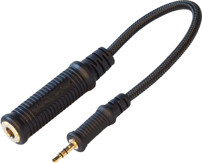 The mini adaptor cable has a 1/8 inch (3.5mm) 'mini-jack' plug with a cable connected to a 1/4 inch (6.3mm) jack plug. The cable eliminates added leverage on the output circuit board of the source.