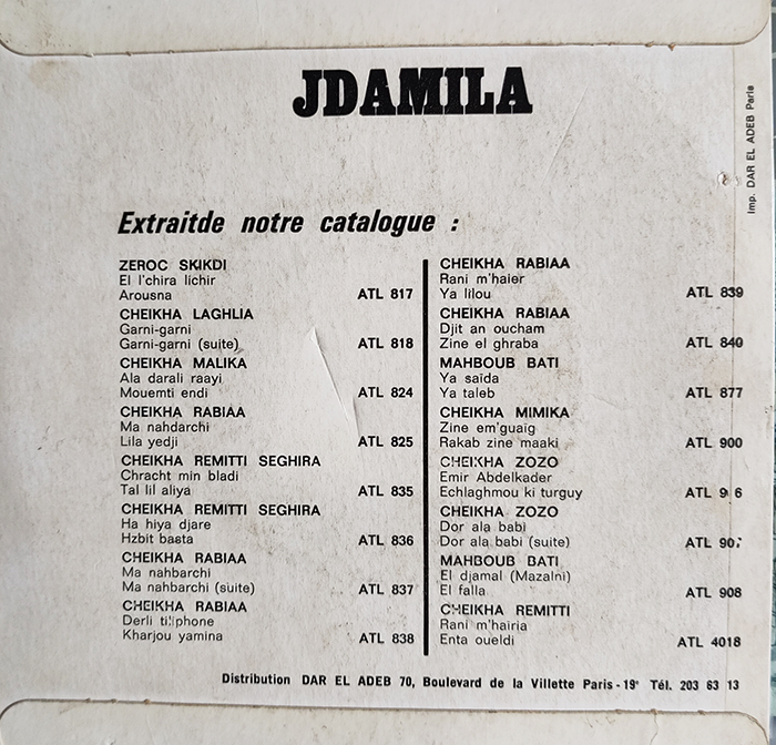 Beautiful songs from the Maghreb. Djamila was an Algerian singer, who was born in 1930 in Aït Bouhini and died in 2019 in Algiers. Original French pressing is in very good condition. There is some surface noise, but otherwise is close to VG+.