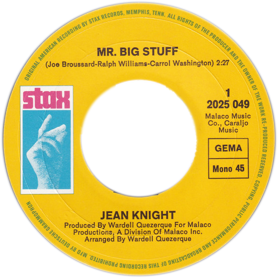 Big soul tune from Jean Knight on Stax.This mono German pressing from 1971 is very clean and comes with picture sleeve.