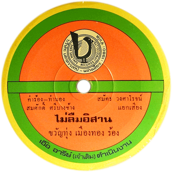 The real treasure is on the B-side, where we find the deeply touching soulful Isaan (Northeastern Thailand) lukthung song 'Don't Forget Isaan' (ไม่ลืมอิสาน). It's the kind of song the leader of the village would play at the start of the day in the early morning, around 5am, through the public speakers waking up the villagers to start the day with a good mood, and to feel proud of where they come from. The singer, Kwanthung Meuangthong (ขวัญทุ่ง เมืองทอง), sings about his love for Isaan, how beautiful the nature, culture and the girls are. The song & lyrics are created by Somsak Sribangchang (สมศักดิ์ ศรีบางช้าง).