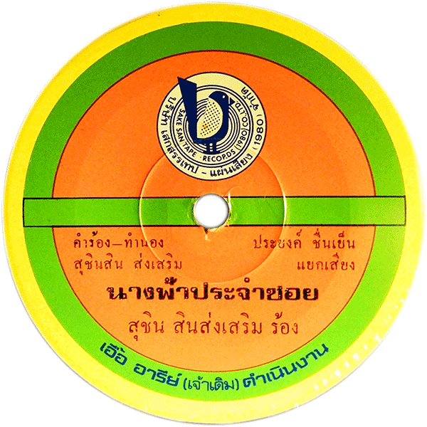 On Side A we find the entertaining Thai lukthung song 'Angel of the Alley' (นางฟ้าประจำซอย) by Suchin Sinsongserm (สุชิน สินส่งเสริม). It's an ode to a beautiful girl Suchin remembers living in a small alley ('soi' in Thai). A good groove, funky hornstabs and a jazzy accompaniment round up this decent track. Suchin composed the song and wrote lyrics himself as well.