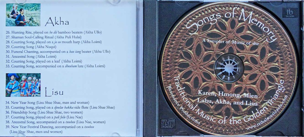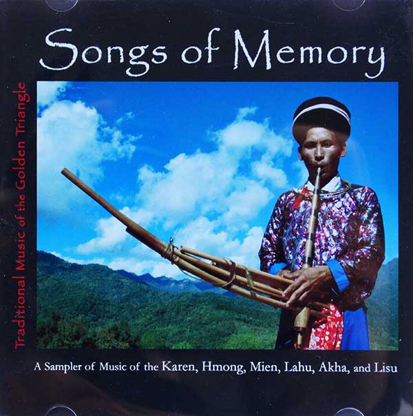 The Songs of Memory compact disc offers a rich and varied collection of secular and sacred music of the Karen, Hmong, Iu Mien, Lahu, Akha, and Lisu people of Laos, Myanmar, Thailand, and China. Cycles-of-life pieces are performed through song, leaf, mouth harp, horn, reed pipes, side flute, end flute, folk clarinet, lute, harp, zither, and bamboo beaters. Ritual chants and ceremonial instruments—shawm, drum, gong, cymbals, bell, and bamboo beater—unfold during sacred observances.