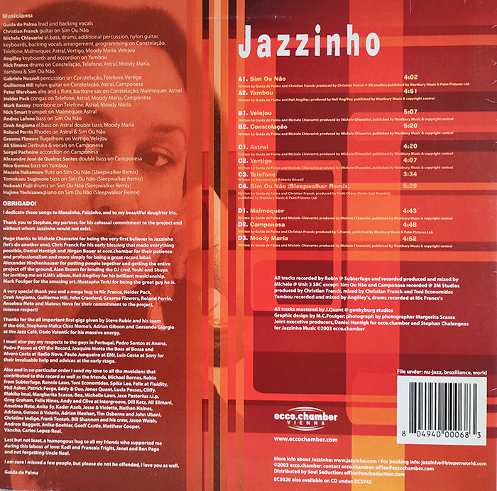 Virtuoso vocalist and songwriter Guida de Palma and multi-instrumentalist Michele Chiavarini have come together to form Jazzinho. This London based outfit records and performs a repertoire of original material in an idiosyncratic style that Guida calls Jazzinho (pronounced jazz-EEN-yo). Jazzinho, loosely translated as "Sweet Little Jazz", is a luscious blend of dance rhythms, Nu-Jazz arrangements, Portuguese traditional instruments, Afro-Brazilian percussions and R&B background vocals with soulful and organic Bossa melodies. Drawing on Jobim/Gil but giving it a twist of newness with effects and dub styles, the songs travel the Bebel Gilberto road but are a little edgier. Guida sings in Portuguese (her native language) and English: although either way, the lyrics seems secondary to the constant shake of the maracas.