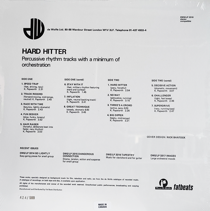 Released in 1975, Hard Hitter features compositions by Keith Papworth, who, in addition to writing hundreds of tracks for de Wolfe Music's production library over the course of three decades, is best known for having his recordings featured in Monty Python skits and movies. Hard Hitter is beloved by crate diggers of all genres for its minimalist orchestration over heavy grooves.