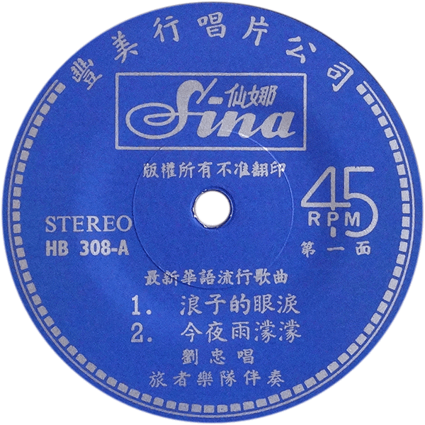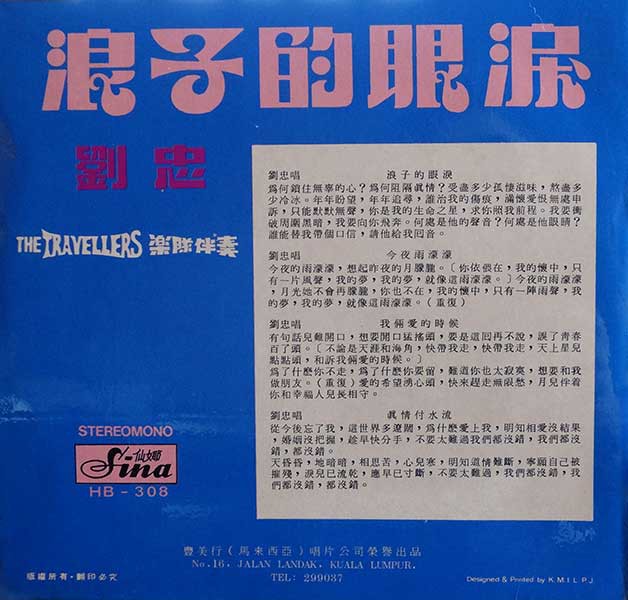 This historic gem record contains 4 songs of Liu Zhong (刘忠), accompanied by the famous Travellers band, on the Sina label from 1972.