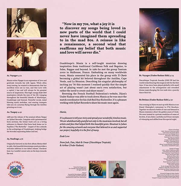 Guadeloupe’s Manix is a self taught musician drawing inspiration from traditional Caribbean Folk and Beguine, to Salsa, Reggae and beyond. In 1980 Manix met the group ‘Tamtam 2000’ in Mulhouse, France. Embarking on many worldwide tours, Manix cemented his place in the group with 'Ti Cherie’ becoming a global hit beloved throughout the Antilles, Cape Verde, and La Réunion. Describing his singular philosophy of inciting joy ”At this moment I realised quickly that the simple act of playing wasn't just about one’s own satisfaction, but rather the need to create and share music”.