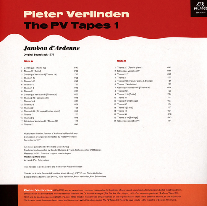 Most of his work was only preserved on the original master tapes in his personal archive, so the majority of Verlinden’s music has never been heard and is unknown. With the album series The PV Tapes, 678 Records pays tribute to the maestro of Belgian film music.